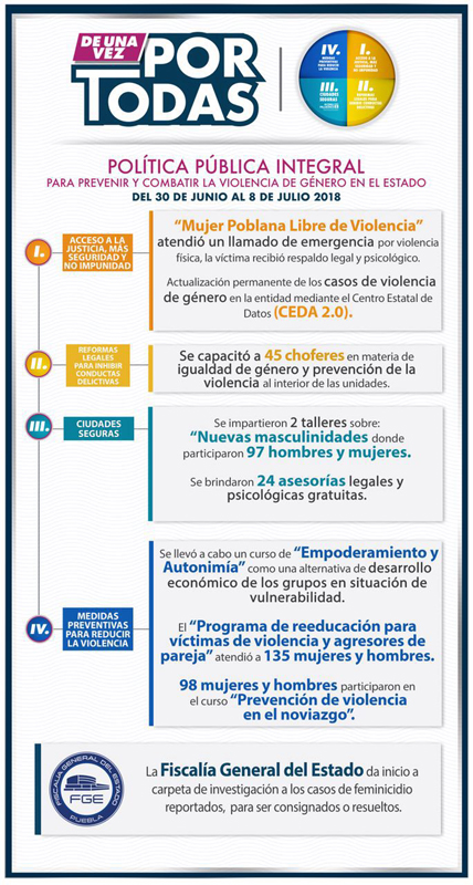Eje 1 (Acceso a la justicia, más seguridad y no impunidad): Durante la semana, la Unidad de Atención “Mujer Poblana Libre de Violencia” de la Secretaría de Seguridad Pública (SSP), atendió un llamado de emergencia por violencia física en Puebla capital. La víctima recibió el respaldo legal y psicológico necesario por parte de la Fiscalía General del Estado (FGE) y el Instituto Poblano de las Mujeres. En el Centro Estatal de Datos (CEDA 2.0) quedó registro de este hecho de violencia, tal como lo indica la cuarta sugerencia de las ocho que realizó la Comisión Nacional para Prevenir y Erradicar la Violencia Contra las Mujeres (Conavim). Eje 2 (Reformas legales para inhibir conductas delictivas): Derivado de la última Reforma a la Ley del Transporte, la Secretaría de Infraestructura, Movilidad y Transportes en coordinación con el Instituto Poblano de las Mujeres (IPM), capacitó a 45 choferes en materia de igualdad de género y prevención de la violencia al interior de las unidades. Eje 3 (Ciudades seguras): Por parte del Instituto Municipal de las Mujeres del ayuntamiento capitalino, se impartieron dos talleres sobre “Nuevas masculinidades” en el cual participaron 65 hombres y 32 mujeres. Adicionalmente, se brindaron 24 asesorías legales y psicológicas gratuitas. Eje 4 (Medidas preventivas para reducir la violencia): Con la finalidad de lograr la igualdad sustantiva y el empoderamiento económico de las mujeres víctimas de violencia en el estado de Puebla, el SEDIF llevó a cabo un curso de “Empoderamiento y Autonomía” como una alternativa de desarrollo económico de los grupos en situación de vulnerabilidad. Finalmente, con el objetivo de fortalecer la cultura de la prevención y la denuncia ante posibles casos de agresión por razones de género, el “Programa de reeducación para víctimas de violencia y agresores de pareja” de la Secretaría de Salud Estatal, atendió a 57 mujeres y 78 hombres. Igualmente, 63 mujeres y 35 hombres participaron en el curso “Prevención de violencia en el noviazgo”.