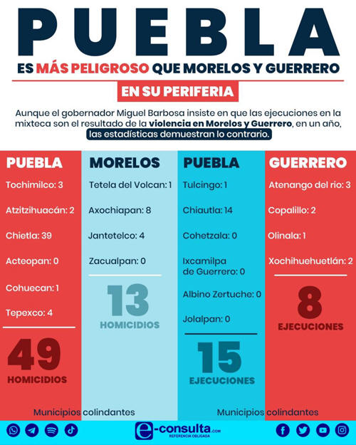 A su vez, el municipio poblano de Chietla acumuló 39 asesinatos, mientras que los cuatro municipios de Morelos que lo rodean juntaron únicamente 13 en el mismo periodo.