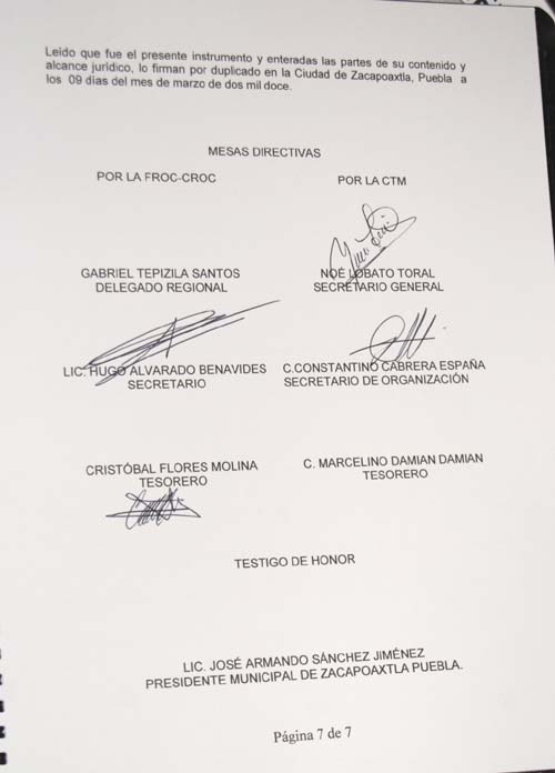 De parte de la CTM, el delegado en este municipio, Noé Lobato Toral comentó que mantienen una buena relación con el actual ayuntamiento, sin embargo requieren que se les tomé en cuenta en un mayor número de obras, por lo que decidieron unirse al otro sindicato para emprender acciones conjuntas. Comentó que en años anteriores se habían presentado algunas disputas entre los agremiados de los dos sindicatos, pero dijo que con la firma del convenio lograrán un mayor beneficio para obtener trabajo para sus integrantes y las familias a quienes se les generan ingresos de manera indirecta.