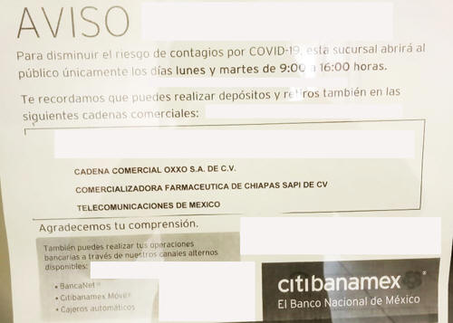 Instituciones bancarias como Banamex, colocaron anuncios en la sucursal de Zacapoaxtla, que los únicos días que abrirán la sucursal serán los días lunes y martes, lo que de nuevo provocará mayor concentración de personas, algunos de ellos, formados en la vía pública sin usar cubrebocas y sin guardar la distancia.