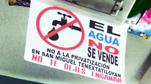 Más de 600 habitantes se reunieron la tarde de este trece de noviembre en el auditorio de Tenextatiloyan y comentaron al alcalde Víctor Iglesias Parra que no permitirán la realización del proyecto porque tiene antecedentes de dejar obras inconclusas, además de que la gente tiene temor de que el agua se privatice a través de inversión privada en el proyecto. El presidente municipal comentó a los pobladores y a los integrantes del comité de agua potable de Tenextatiloyan, que durante siete meses se realizaron los estudios de factibilidad del proyecto y el recurso superior a los doce millones de pesos ya fue autorizado, por lo que se tiene programado iniciar la obra. Los integrantes del comité comentaron al alcalde, que no fueron tomados en cuenta para elaborar este proyecto, además de que la gente no cuenta con la información necesaria y están en desacuerdo de la instalación de medidores en los hogares de esta junta auxiliar. La reunión terminó con el compromiso de parte del ayuntamiento, de entregar el proyecto al comité de agua potable de Tenextatiloyan para que sea analizado, aunque la gente dijo que si durante asamblea general, la gente no acepta el proyecto, no permitirán que inicien los trabajos.