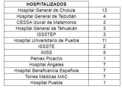 Uribe Téllez explicó que, del total de personas contagiadas, 181 corresponden a la ciudad de Puebla, 22 a San Andrés Cholula, ocho a San Pedro Cholula, tres a Tlapanalá, dos a Teziutlán, dos a Tehuacán, dos a Huaquechula,  dos a Huejotzingo, dos a Chalchicomula de Sesma, 10 a Izúcar de Matamoros, ocho a Atlixco, dos a Chietla, ocho a Tulcingo del Valle, y uno de Chiautzingo, Amozoc, Tepeojuma, Cuautlancingo, Ocoyucan, Zautla, Chinantla, Chila de la Sal, Chiautla de Tapia y San Salvador El Seco.