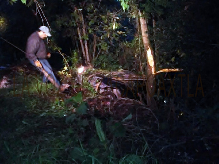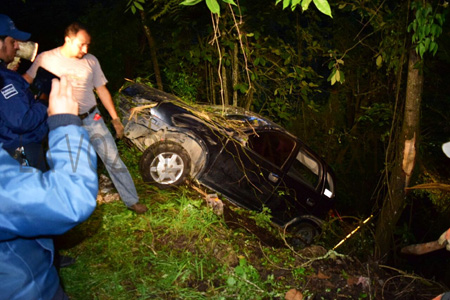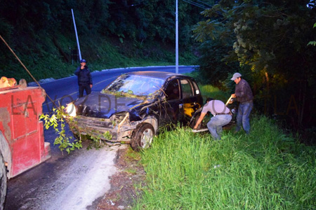 Equipo de grúas Zacapoaxtla, realizó las maniobras para el rescate de esta unidad chevy, color azul marino, placas de circulación TYZ-8036 del estado de Puebla y se informó que de acuerdo al peritaje el conductor perdió el control del vehículo por conducir con exceso de velocidad, lo que propició que al llegar a una curva perdiera el control, se impactó contra un árbol y más tarde se precipitó sobre la ladera.