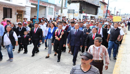 A las 11:30 horas, danzas, grupos culturales y ciudadanos en general de la cabecera municipal, juntas auxiliares y comunidades, acompañaron al alcalde a lo largo de un desfile que recorrió la avenida Reforma, el cual culminó en el centro de la ciudad que fue declarado recinto oficial para reanudar la primera sesión ordinaria de cabildos, la cual inició en los primeros minutos de este lunes.