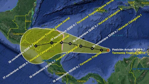 Afectará la misma región que dos semanas atrás sufrió el violento embate del huracán Eta, que dejó más de 200 muertos y 2.5 millones de afectados en el istmo. El Centro Nacional de Huracanes de Estados Unidos (NHC) reveló que Iota alcanzó vientos máximos de 260 km/h horas antes de que arremeta contra el Caribe centroamericano, entre Nicaragua y Honduras. “Se espera que Iota se mantenga como un catastrófico huracán categoría 5 al acercarse esta noche (del lunes) a la costa noreste de Nicaragua", indicó el NHC en un reporte. Advirtió que se esperan "fuertes lluvias, inundaciones repentinas y crecidas de ríos que amenazan la vida" a lo largo de partes de Centroamérica. El impacto sería mayor en el noreste de Nicaragua y el este de Honduras, zonas aún devastadas por Eta. La evacuación masiva de las comunidades nicaragüenses de Karatá, Wonta, Wawabar, golpeadas por Eta, saturó los refugios, que el domingo recibieron aún más personas ante la amenaza de Iota, dijo Eufemia Hernández, coordinadora de uno de los albergues en la universidad Uraccan. “Son muchas familias grandes (….) este albergue está demasiado lleno, no tienen platos, vasos, cucharas, ni alimentos. No cocinamos nada porque es demasiada gente", admitió Hernández. El director del Sistema Nacional de Prevención, Mitigación y Atención de Desastres (Sinapred) de Nicaragua, Guillermo González, informó que se prevén inundaciones y deslaves en el Caribe Norte y en los departamentos de Chinandega, principalmente en los alrededores del Volcán Casitas, donde el huracán Mitch de 1998 sepultó a miles de personas tras un derrumbe. El noreste de Nicaragua, una región extensa y poco poblada, con habitantes de las etnias miskito, sumos, garífonas, creole y mestizos, recibió el 3 de noviembre el impacto del huracán Eta, cuyos efectos aún no terminaban de ser asimilados cuando surgió Iota, la tormenta 31 de la temporada. (Megalópolis mx).