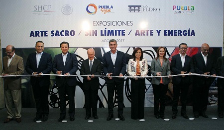 Inaugura Tony Gali exposiciones "Arte sacro", "Sin límite" y "Arte y energía" 17 Agosto 2017 Puebla.- El gobernador Tony Gali y el director general de Promoción Cultural, Obra Pública y Acervo Patrimonial de la Secretaría de Hacienda y Crédito Público (SHCP), José Ramón San Cristóbal, encabezaron la inauguración de las exposiciones "Arte Sacro", "Sin Límite" y "Arte y Energía". El mandatario, acompañado de la Presidenta del Patronato del Sistema Estatal DIF, Dinorah López de Gali, destacó que el recinto San Pedro Museo de Arte albergará 33 obras que combinan el arte con el desarrollo industrial, 15 que incluyen pinturas al óleo, tableros de talavera, esculturas y un misal antiguo, así como un mural sobre un panel de 140 metros cuadrados. En el evento estuvieron presentes la Presidenta del Patronato del Sistema Municipal DIF, Susy Angulo de Banck; el Secretario de Cultura y Turismo, Roberto Trauwitz; el Auditor Superior del Estado, David Villanueva y el director de Museos de Puebla, Iván de Sandozequi Cornejo, entre otros invitados especiales.