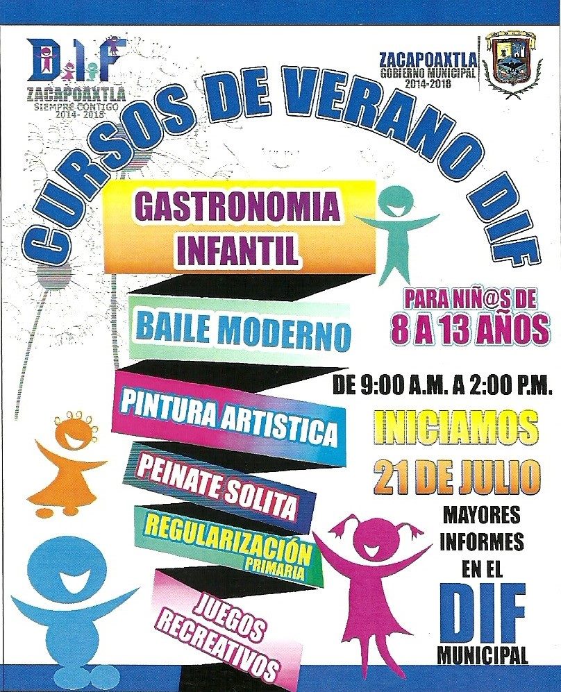 La presidenta del DIF, Margarita Lobato Toral, informó que para las niñas de ocho a trece años se impartirán los cursos de baile moderno de las 9:00 a las 11:00 y de 12:00 a 14:00 horas el de Péinate solita, en tanto que para niños serán con los mismos horarios pero los cursos de pintura artística básica y el de juegos recreativos.