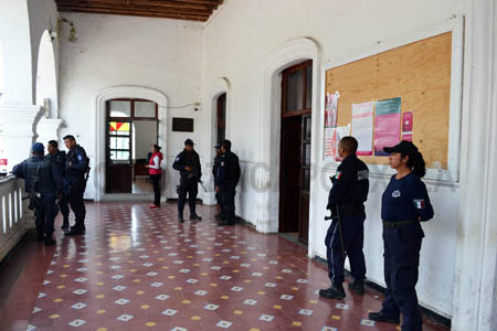 Frente a la alcaldía permanecen dos patrullas de la policía municipal y una más de la Policía Estatal Preventiva (PEP) y en el acceso principal, los uniformados se encontraban frente a la sede de la comandancia.