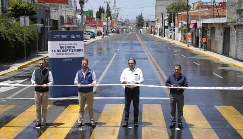 En ambas vialidades se retiró el pavimento para dar paso a la colocación de concreto asfáltico, se realizó desazolve, así como la limpieza de brocales y rejillas. Cabe destacar que también se construyeron guarniciones y banquetas, rampas para personas con alguna discapacidad y señalética, en beneficio de más de 143 mil habitantes de la zona. Inicia mejoramiento de avenida nacional en Amozoc En tanto, en el municipio de Amozoc, el gobierno estatal puso en marcha el mejoramiento con concreto asfáltico de la Avenida Nacional con una inversión de 33.7 millones de pesos, que tendrá alrededor de cien mil beneficiarios. Esta vía ubicada en la junta auxiliar de San Salvador Chachapa permitirá que los pobladores, comerciantes y campesinos se trasladen con facilidad, rapidez y seguridad, generando un importante impacto social y económico entre Amozoc y la capital. El encargado de despacho de la Secretaría de Infraestructura, Movilidad y Transportes, Sergio Barrera Alejandre, explicó que esta obra tiene una longitud de 3.4 kilómetros y 7 metros de ancho, constará de una capa asfáltica de 30 centímetros de espesor, la construcción de banquetas y guarniciones con concreto hidráulico. Estuvieron presentes el Secretario de Infraestructura y Servicios Públicos del Ayuntamiento de Puebla, David Aysa de Salazar; el alcalde de Amozoc, José Cruz Sánchez; entre otros.