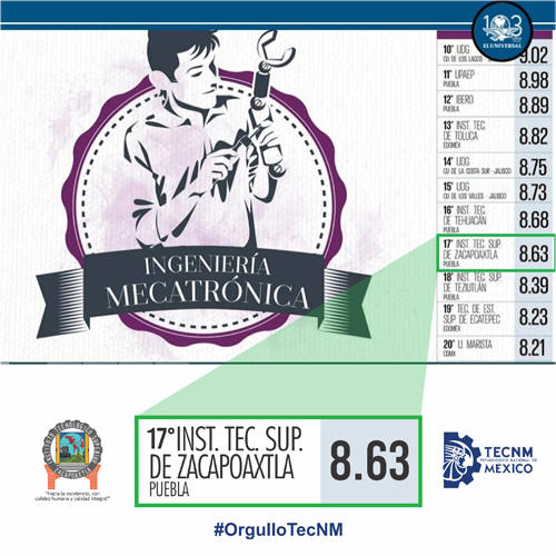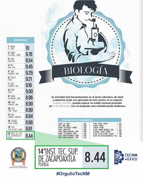 Los Programas de estudio evaluados del Instituto Tecnológico Superior de Zacapoaxtla de acuerdo al ranking de programas de licenciatura son: Lic. Biología obteniendo el lugar número 14 Ing. Mecatrónica obteniendo el lugar número 17 Continuaremos trabajando para mejorar día a día en el ámbito de la educación superior y así lograr coadyuvar significativamente en la calidad educativa a nivel local, regional, estatal y nacional. “Hacia la excelencia con calidez humana y calidad integral”