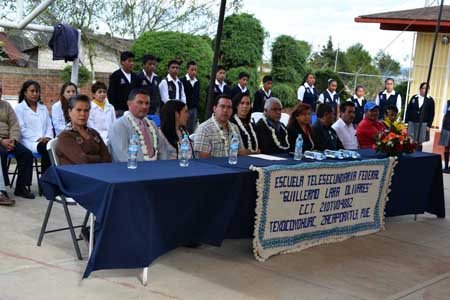 Dentro del programa de inauguración, los integrantes del Ayuntamiento participaron con el izamiento de la bandera blanca que certifica a esta Telesecundaria como Escuela Saludable, gracias a los trabajos del personal de salud en prevención de embarazos en los alumnos de esta institución.