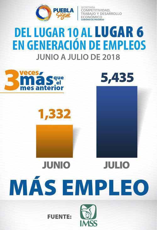 Asimismo informó que, de acuerdo al último reporte de julio del Instituto Mexicano del Seguro Social (IMSS), en el estado se crearon 5 mil 435 nuevos empleos, es decir, tres veces más que los generados en junio, que corresponde a un aumento de 308 por ciento. Dicha cifra refrenda el dinamismo de la economía poblana y la colaboración entre el gobierno estatal y el sector empresarial -responsable de la generación de empleos- por lo cual Puebla sigue repuntando en este rubro a nivel nacional al avanzar cuatro posiciones, al pasar de la décima en junio, al lugar seis durante julio a nivel nacional. Con esto, la suma de vacantes ocupadas en esta administración es de 51 mil 241 empleos formales, y la creación mensual promedio en la entidad pasó de 2 mil 694 a 2 mil 84 durante la presente administración estatal, la más alta en la historia. En el escenario nacional, Puebla genera el 3.1 por ciento de los empleos en México, que corresponde a 618 mil 984 trabajadores registrados ante el IMSS, a julio de 2018, de los 19 millones 949 mil 244 que existen ante dicho instituto. Con respecto a la variación anual, entre julio 2017 y el mismo mes pero de 2018, se indica para Puebla un valor de 4.9 por ciento, que sitúa a la entidad por arriba de la media nacional, que es de 4.1 por ciento. Cabe destacar que como parte de la estrategia de vinculación laboral y de apoyo exitoso en la búsqueda de trabajo, Tony Gali invitó a la segunda Feria Regional de Empleo que se realizará el próximo jueves 23 de agosto en Ciudad Modelo, en las instalaciones del Centro de Convenciones ubicado en calle Constitución 5 de Febrero y bulevar Audi Sur, en San José Chiapa, Puebla, de 8 a 14 horas, con entrada libre.