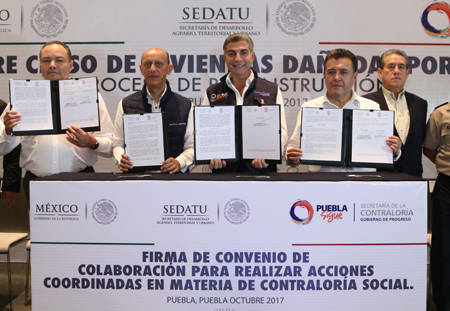 Tony Gali y Juan Carlos Lastiri signaron, como testigos de honor, el convenio entre la Sedatu y la Secretaría de la Contraloría del estado, cuyo objetivo es verificar la correcta entrega de recursos en la reparación, construcción y autoconstrucción. Estuvieron presentes el Comandante de la 25 Zona Militar, Raúl Gámez; el Secretario de la Contraloría, Rodolfo Sánchez; el Secretario Técnico de la Sedatu, Alberto Amador Leal; el delegado de la Sedatu en Puebla, Juan Manuel López; el Secretario de Desarrollo Social, Geradro Islas; el titular de la Secretaría de Administración y Finanzas, Raúl Sánchez Kobashi y el Coordinador para la Reconstrucción, Eugenio Mora.