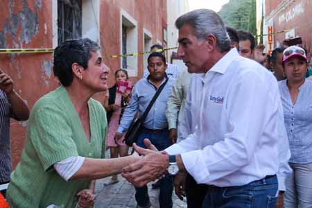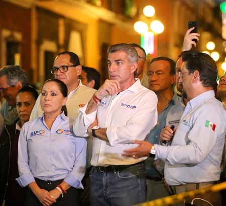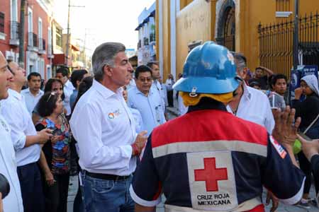 “Puebla está de pie, estamos muy solidarios, muy fuertes. Yo quiero que las familias estén muy fuertes, trabajando para levantarnos de esta tragedia que estamos lamentando”, aseveró el mandatario. Reiteró que no se van a escatimar recursos para que los deudos reciban apoyo económico y psicológico; de igual forma quienes tuvieron daños en sus viviendas, para que puedan hacer frente a esta situación de la mejor manera posible. Mencionó que se ha establecido un trabajo coordinado con el gobierno federal, Ejército y Marina por lo que reiteró el apoyo total a los poblanos e informó que próximamente realizará un recorrido en conjunto con el Presidente, por las zonas afectadas. El Secretario General de Gobierno, Diódoro Carrasco, reportó que se han registrado daños en 18 municipios de la entidad, de manera principal en la capital, área metropolitana, la ruta Izúcar-Chiautla de Tapia y Atlixco, donde se han presentado decesos, afectaciones en edificios públicos, escuelas, hospitales e iglesias.