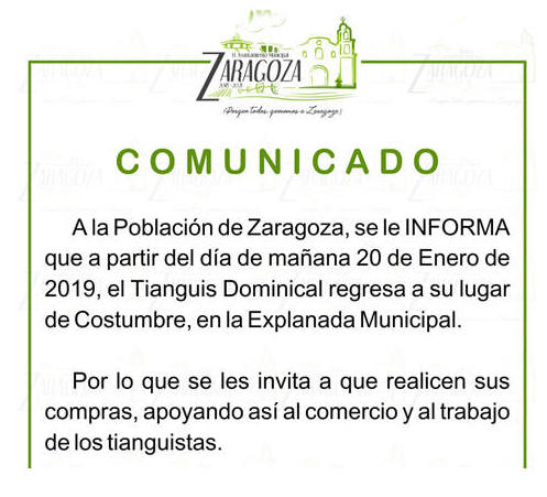 Sin embargo los líderes del tianguis entablaron un diálogo con las autoridades y les hicieron saber que existe un acta de cabildos con fecha 28 de febrero de 2018, en donde se acordó con la administración anterior, la reubicación del tianguis, con el objetivo de mejorar la imagen del centro de Zaragoza y apoyar en los trabajos de rehabilitación del auditorio, el zócalo y el palacio municipal.