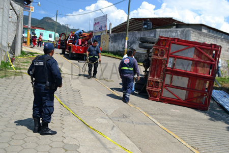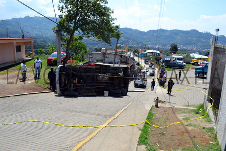 Fue a las 13:30 horas cuando la unidad modelo 1992, con placas de circulación LA-79099 del Estado de México, circulaba sobre la calle principal de esta localidad y debido al peso de la carga se volcó sobre su costado derecho, lo que provocó que las cuatro personas que viajaban en la parte trasera salieran proyectadas hacia el pavimento.