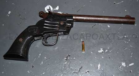 Los detenidos son Bonifacio Xochiateno “N” de 19 años de edad y su hermano Rafael Xochiateno “N” de 26 años, ambos con domicilio en la calle Tepezinta en la sección segunda de San Juan Tahitic, quienes portaban una pistola calibre 22, con la leyenda en el cañón “fulminante y munición para adulto”, y a la altura del disparador otra leyenda “K-6ZPA”.
