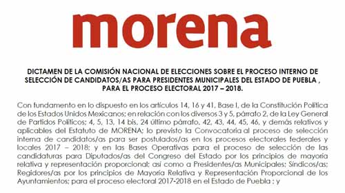 El Partido Morena emitió el dictamen de la comisión nacional de elecciones sobre el proceso interno de selección de candidatos a presidentes municipales para el periodo electoral 2017 – 2018, el cual afirmaron que se emitió luego de analizar la documentación presentada por los aspirantes, verificar los requisitos que impuso la comisión y sobre todo que se tratara de las personas que consolidaran la estrategia política de los partidos de la coalición. En el apartado sexto del dictamen fechado el 19 de marzo de 2018 en la ciudad de México por la Comisión Nacional de Elecciones se establece que una vez realizados los procedimientos estatutarios se procedió a la designación de los candidatos de los 217 municipios del estado de Puebla. En la región Nororiental de Puebla, los municipios con mayor concentración de votantes son Teziutlán, cabecera de distrito federal y local, en donde se eligió como candidata a Concepción González Molina, en Tlatlauquitepec, cabecera de distrito local el candidato designado fue Clemente Ramírez Leal y en otro municipio cabecera de distrito como Zacapoaxtla se eligió como candidato a Ebodio Santos Alejo. Otros municipios que aportan una gran cantidad de votos y donde se espera una contienda cerrada por las alcaldías son Cuetzalan donde se eligió como candidata a Rufina Edith Villa Hernández, una mujer identificada con las causas sociales y de apoyo a mujeres indígenas, en tanto que en Huehuetla la candidata será Alba Barrientos Aldana. En Zaragoza fue electa como candidata Anita Reyes García, en Nauzontla María de Lourdes Juárez Inés, en el municipio que gobierna Antorcha Campesina que es Huitzilan de Serdán el candidato de Morena es Jesús Ramos Xalcuaco, en Xochitlán de Vicente Suárez Daría Marín Gutiérrez, en Xochiapulco Aníbal Díaz Rodríguez, en Zautla fue electo el ex presidente municipal Víctor Manuel Iglecias Parra. Otras designaciones de esta región fueron Pedro Rodríguez de Gaona candidato a la alcaldía de Zoquiapan, Salvador Tino Martínez de Zapotitlán de Méndez, Elizabeth Lourdes Martínez Romano para la alcaldía de Teteles de Ávila Castillo, Sonia Rodríguez Hernández en Libres, Urbano Bernabé Serrano a la alcaldía de Jonotla y Francisco Javier Guerrero Montes candidato a la presidencia de Ayotoxco de Guerrero.