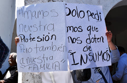 Lizbeth Lara de la Calleja, delegada sindical de la sección 25, informó que esta situación la enfrentan Hospitales Generales, Hospitales Integrales, y clínicas de salud, en donde carecen de insumos básicos como cubrebocas, jabón líquido, gel antibacterial, guantes, además del medicamento faltante.