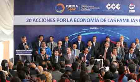 Por su parte, el Presidente de Consejo Coordinador Empresarial, Carlos Montiel Solana, señaló que este acuerdo, firmado por 33 representantes de organismos empresariales y 9 federaciones y confederaciones sindicales, es un hecho sin precedente en todo el país, porque Puebla es el primer estado en signar un convenio que concreta acciones a corto plazo en favor de la economía familiar. En tanto, el Presidente del Congreso del Trabajo, Asunción Jaramillo, señaló que esto es el resultado del diálogo y la apertura por parte del estado y del sector productivo, que dan muestra de la paz y estabilidad construida en los últimos años. Finalmente, el alcalde Luis Banck destacó que la firma de las 20 acciones por la economía de las familias poblanas, demuestra la capacidad de convocatoria y la vocación de servicio del gobernador Tony Gali y subrayó que es el reflejo de que los poblanos quieren que Puebla siga avanzando. Los puntos del acuerdo son: 1.- Los sectores empresarial y laboral se comprometen a no especular con los precios de los bienes y servicios, particularmente de aquellos que forman parte de la canasta básica. 2.- Los firmantes se comprometen a que no aumenten las tarifas de transporte público de competencia local. 3.- El Gobierno del Estado se compromete a aumentar el presupuesto destinado a seguridad pública. 4.-El Gobierno del Estado se compromete a incluir, en el proyecto de presupuesto de ingresos 2018, la reducción del Impuesto sobre Erogaciones por Remuneraciones al Trabajo Personal (ISN) del 3% al 2%. 5.-Los firmantes se comprometen a lanzar, de manera conjunta, una campaña en favor del consumo de bienes y servicios poblanos. 6.-El Gobierno del Estado se compromete a diseñar una estrategia integral para la atención a los migrantes poblanos. 7.-El sector empresarial se compromete a promover la inclusión de los migrantes poblanos en la planta productiva local. 8.-Las partes se comprometen a trabajar de manera conjunta para agilizar el tránsito vehicular en el bajo puente del segundo piso de la autopista México-Puebla. 9.- El Gobierno del Estado se compromete a fomentar esquemas que impulsen la participación de empresas poblanas en licitaciones gubernamentales. 10.-El Gobierno del Estado se compromete a garantizar, en el ámbito de sus atribuciones y con pleno respeto a las facultades conferidas por el artículo 115 constitucional a las autoridades municipales, que la concesionaria del servicio de agua en la Zona Metropolitana de la Ciudad de Puebla, cumpla con el programa de inversión estipulado y las demás obligaciones a su cargo. 11.-Las organizaciones empresariales se comprometen a promover esquemas que impulsen la participación de empresas poblanas en las cadenas de proveeduría local. 12.-El Gobierno del Estado se compromete a crear un área especializada para la promoción de Puebla como destino de inversiones. 13.-Los sectores empresarial y sindical se comprometen a identificar trámites del orden estatal susceptibles de mejora o eliminación y el Gobierno del Estado a analizar su pertinencia y eventual aplicación. 14.-Los firmantes se comprometen a revisar en conjunto la Ley de Desarrollo Económico Sustentable e identificar áreas de mejora para la promoción de inversión, apertura de empresas y generación de empleo. 15.-Los firmantes se comprometen a facilitar el acceso de las micro, pequeñas y medianas empresas (MiPYMES) a tecnologías para la mejor administración de los negocios. 16.-Los firmantes se comprometen a impulsar la vinculación de pequeños y medianos productores agroindustriales, mediante esquemas de agricultura por contrato. 17.-Los firmantes se comprometen a promover, de manera conjunta, la incorporación de tecnologías y mejores prácticas de sustentabilidad ambiental en las actividades económicas de la entidad. 18.-Los firmantes se comprometen a sumar esfuerzos para fomentar la inclusión laboral de grupos vulnerables y combatir el trabajo infantil. 19.-Los sectores empresarial y sindical se comprometen a identificar a los trabajadores en condición de analfabetismo y rezago educativo para facilitar su formación y capacitación, en coordinación con las autoridades educativas. 20.-Los sectores empresarial y sindical se comprometen a fomentar condiciones de formalidad en las empresas. En el evento estuvieron presentes el Secretario General de Gobierno, Diódoro Carrasco Altamirano; el Jefe de la Oficina del Gobernador, Javier Lozano Alarcón; los Presidentes del Tribunal Superior de Justicia, Roberto Flores Toledano, y de la Junta de Gobierno y Coordinación Política del Congreso del Estado, Jorge Aguilar Chedraui, así como los representantes de las cámaras empresariales, sindicalistas y del sector obrero.