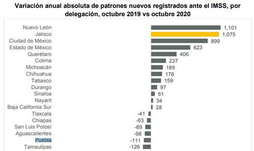En contraste, Nuevo León se encuentra en primer lugar en octubre de 2020 en comparación con el año anterior en generar mil 101 registros de nuevos patrones. En segunda posición está Jalisco con mil 75 y en tercer lugar Ciudad de México con 899 empresas.