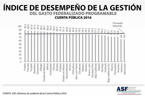 Puebla, calificado como mejor estado en comprobación del gasto federalizado · En el ejercicio 2016 se obtuvieron 90.3 puntos 24 febrero 2018 Puebla.- De acuerdo con el Informe General Ejecutivo de la Cuenta Pública 2016, emitido por la Auditoría Superior de la Federación (ASF), la entidad logró un óptimo desempeño en la gestión del gasto federalizado, pues alcanzó 90.3 puntos frente al promedio nacional de 64.1 puntos. La ASF practicó 23 auditorías a una muestra de 69 mil 137.9 millones de pesos del presupuesto asignado y sólo 1.1% se observó como un monto por aclarar. Al respecto, la administración cuenta con un periodo de 30 días hábiles para dar atención a estas sugerencias. Cabe resaltar que de las 23 auditorías, seis resultaron sin observaciones y cinco con observaciones administrativas. El gobierno de Puebla ha concentrado todos sus esfuerzos para lograr la aplicación oportuna de los recursos públicos, muestra de ello es que en la auditoría a Participaciones Federales, cuya muestra fue de 18 mil 538.6 millones de pesos, no se determinaron observaciones económicas. Durante 2016, las entidades mejor evaluadas fueron Puebla con 90.3 puntos, Tlaxcala con 88.9 y Yucatán con 87.9. Esto, refleja el compromiso de las autoridades locales por hacer un uso responsable del presupuesto en beneficio directo de las familias.