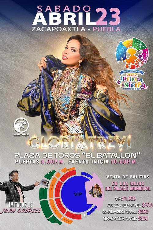 Para el 23 de abril, se presentará Gloria Trevi, con un costo de 1000 pesos VIP, 700 pesos grada primer nivel, 500 pesos gradas segundo nivel y 300 pesos gradas tercer nivel.