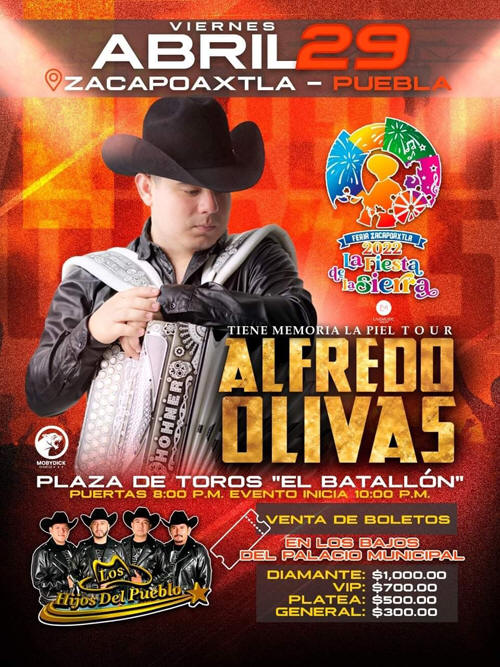 El 29 de Abril hará su presentación Alfredo Olivas, con un costo de 1000 pesos zona Diamante, 700 pesos el VIP, 500 Platea y 300 en zona General.