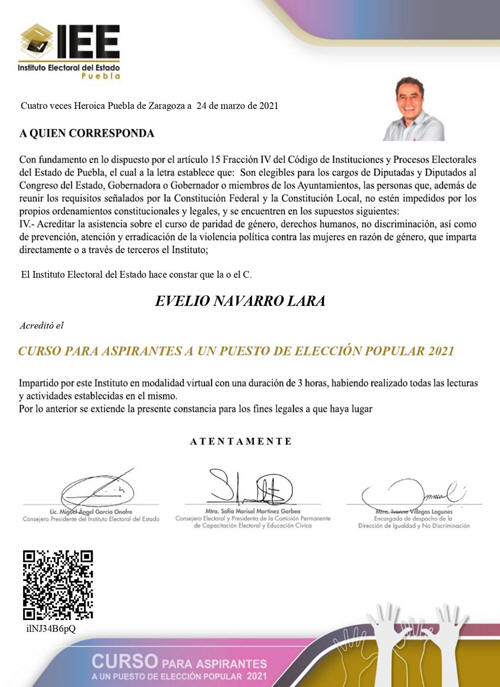 “Sin duda para las personas que aspiran a un puesto de elección popular es medular prepararse lo mejor posible para poder ofrecer a los ciudadanos las soluciones que necesitan y no solo discursos. ¡Vamos a seguir preparándonos de la mejor forma posible, a cumplir todos los requisitos que marca la ley en este proceso y a dar lo mejor que tenemos! ¡Zacapoaxtla y su gente merece lo mejor!”, expresó Navarro Lara. Durante el curso, el IEE, capacita a quienes aspiran a un cargo de elección popular, en temas como el Derecho Electoral, el cual es el derecho subjetivo de la ciudadanía de elegir, además de que es un conjunto de normas y reglas constitucionales para la organización y realización de las elcciones. También se imparten temas como el Marco Normativo y Legal del Derecho Electoral, pasando por la Constitución Política de México, así como los tratados Internaciones. Fundamental durante los cursos, tomar capacitación acerca de principios constitucionales, la manera en que se renuevan los poderes ejecutivo, legislativo y judicial, así como el conocimiento de la manera en que se organizan las elecciones y la responsabilidad que adquiere un servidor público. Evelio Navarro expresó que uno de los principales compromisos de alguien que pretende gobernar, es prepararse en todos los ámbitos y uno de ellos que es fundamental es que ya en este mes de marzo, cuenta con la constancia de este curso y seguirá con la preparación en próximos días.