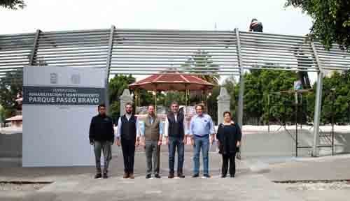 La intervención del Paseo Bravo, que se realiza con recursos municipales, consiste en la dignificación de las fuentes, monumentos, sanitarios y jardineras; así como la construcción de un pergolado en el área del kiosko.