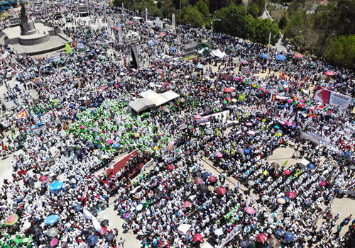 Acompañado de la dirigente nacional de Morena, Yeidckol Polevnsky, del diputado federal y presidente de la Junta de Coordinación Política de la Cámara de Diputados, Mario Delgado, así como de los presidentes nacionales de los Partidos Verde Ecologista y del Trabajo, Carlos Alberto Puente y Alberto Anaya, respectivamente; el abanderado se dirigió a las casi 100 mil personas que se reunieron en este cierre de campaña estatal en la Plaza de la Victoria de la Unidad Cívica 5 de Mayo a quienes dijo: “sonrían porque vamos a ganar. En el 2018 les dije que no iba a cansarme, que no me iba a rajar y no me iba a abrir, que llegaría hasta donde topara y topamos con mucho; aquí estamos, este ganso no se cansa y con su voto este 2 de junio vamos a ganar”.