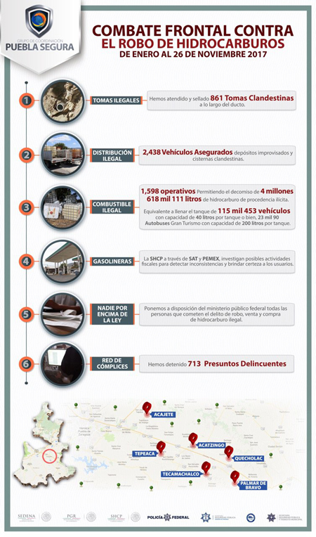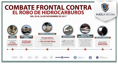 En el mismo periodo, se logró la detención de cuatro presuntos delincuentes, el aseguramiento de 34 vehículos y el sellado de 41 tomas clandestinas. En cuanto a lo que va del año, el total de combustible robado decomisado alcanza ya los 4 millones 618 mil 111 litros. Lo anterior, gracias a mil 598 operativos, cuyos resultados abarcan 861 tomas clandestinas selladas, 713 personas puestas a disposición de la Procuraduría General de la República y el aseguramiento de dos mil 438 vehículos. Las instituciones federales y estatales que integran Puebla Segura reafirman el compromiso permanente de combatir la delincuencia organizada para preservar la tranquilidad de la ciudadanía.