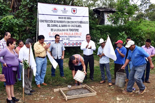 Cuetzalan.- El Presidente Municipal Óscar Paula Cruz y Regidores del Ayuntamiento, dieron el banderazo de arranque de la construcción de un pavimento con concreto hidráulico en la localidad de Tenextepec, además de que se acordó con los ciudadanos la construcción de otro pavimento en la localidad de Xocota y la construcción de un drenaje en las localidades de Cuamayta – Pinahuista.
