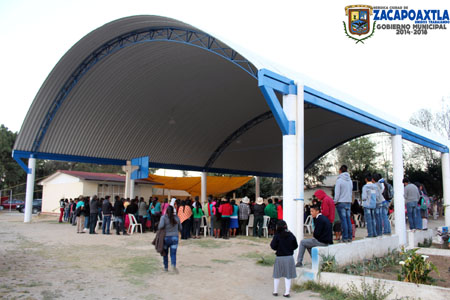 Zacapoaxtla.- Con una inversión de 805 mil 845 pesos, el Presidente Municipal Guillermo Lobato Toral, realizó la tarde de este 27 de febrero, la inauguración del techado de la plaza cívica de la Telesecundaria “José María Anaya” de la comunidad de El Molino.