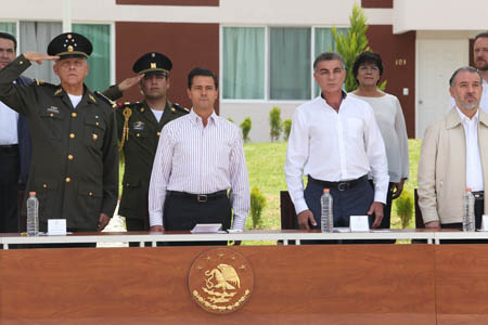 Señaló que con la entrega de estos edificios se garantiza el derecho al acceso de la vivienda digna y decorosa, como un acto de retribución a las grandes acciones que realizan por el país. Por su parte, el comandante de la VI Región Militar, Juan Manuel Rico, celebró la iniciativa del Presidente Enrique Peña Nieto de entregar a las tropas estos inmuebles que alojarán a más de 800 personas que integran 217 familias, los cuales están compuestos por 13 edificios de 16 departamentos y cuentan con cancha de usos múltiples, tres módulos de convivencia, estacionamiento y más de 21 mil metros cuadrados de áreas verdes. Al evento asistieron los secretarios de la Defensa Nacional, Salvador Cienfuegos Zepeda; de Gobernación, Miguel Ángel Osorio Chong; de Desarrollo Agrario, Territorial y Urbano, Rosario Robles; el Procurador General de la República, Raúl Cervantes Andrade y el Director del Centro de Investigación y Seguridad Nacional, Eugenio Ímaz Gispert. También el Comisionado Nacional de Seguridad, Renato Sales Heredia; el Jefe del Estado Mayor Presidencial, Roberto Miranda Moreno; el Comandante de la 25 Zona Militar, Raúl Gámez; el Presidente del Honorable Tribunal Superior de Justicia del Estado, Roberto Flores Toledano y el alcalde de Puebla Luis Banck Serrato, entre otros invitados especiales.