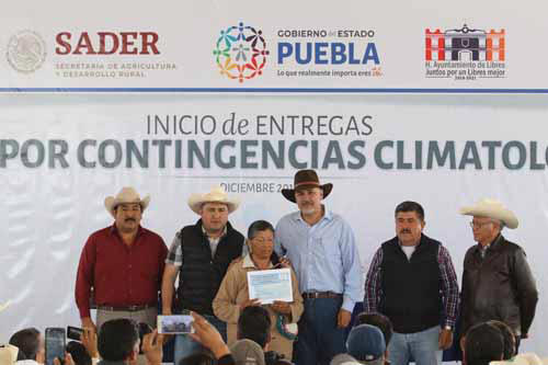 L El secretario de Desarrollo Rural, Franco Rodríguez, entregó 333 cheques a campesinos de la región, para resarcir daños ocasionados por inclemencias del tiempo en 478 hectáreas en los municipios de Libres, San José Chiapa, San Salvador el Seco, Tlatlauquitepec, entre otros. El titular de la dependencia estatal, aseguró que en próximos días se estarán entregando más de 4.5 millones de pesos en cheques de contingencias dictaminadas de la región. Asimismo señaló que durante el primer semestre del año se apoyarán a más de 10 mil pequeños productores en 48 municipios con un total de $26,401,555.00 “Más de un millón de hectáreas están aseguradas en nuestro estado, haciendo de Puebla un referente nacional. La Secretaría de Desarrollo Rural tiene un gran compromiso con el campo y con los pequeños productores y por supuesto ve en ustedes un gran potencial para generar el bienestar de Puebla” El evento estuvo acompañado por el Subsecretario de Desarrollo Rural, Gonzalo Lobato Escamilla; Franco Xavier Rodríguez Rivero; Presidente municipal de Libres, Guillermo Pozos Juárez, Presidente municipal de Oriental y Manuel Herrera Ponce, Alcalde del municipio los Reyes De Juárez.