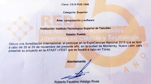 Los participantes de este proyecto elaborado en las aulas del Tec de Teziutlán, fueron la Maestra Cristina Joaquín Salas como asesora y el alumno Luis Ángel de Jesús Sotero, ambos integrantes de la Ingeniería en Sistemas Computacionales. Sin duda el trabajo de todo un año se ve reflejado en el éxito obtenido en estos niveles y de igual manera confirma la calidad educativa de docentes y alumnos del Instituto Tecnológico Superior de Teziutlán. La comunidad tecnológica expreso: “Nuestro reconocimiento y felicitación a nuestro alumno y docente por tan valioso triunfo y haber representado orgullosamente a nuestra Institución”.