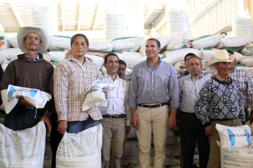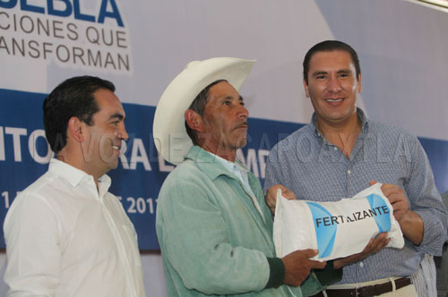 Moreno Valle acompañado del presidente municipal Mario Alberto Cruz González y el secretario de Desarrollo Rural Adalberto González Hernández, entregaron fertilizante por un millón 400 mil pesos que beneficiará a 265 agricultores.
