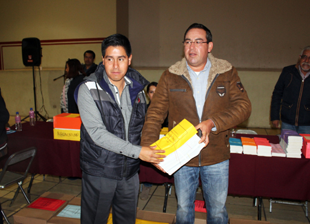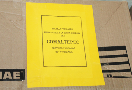 La mañana de este jueves, el Presidente Municipal Guillermo Lobato Toral realizó la entrega de las boletas a los presidentes auxiliares y jueces de paz, a quienes recordó que el dinero recabado en los tres años anteriores, se destinó a obras y entrega de materiales y apoyos en cada una de las localidades.