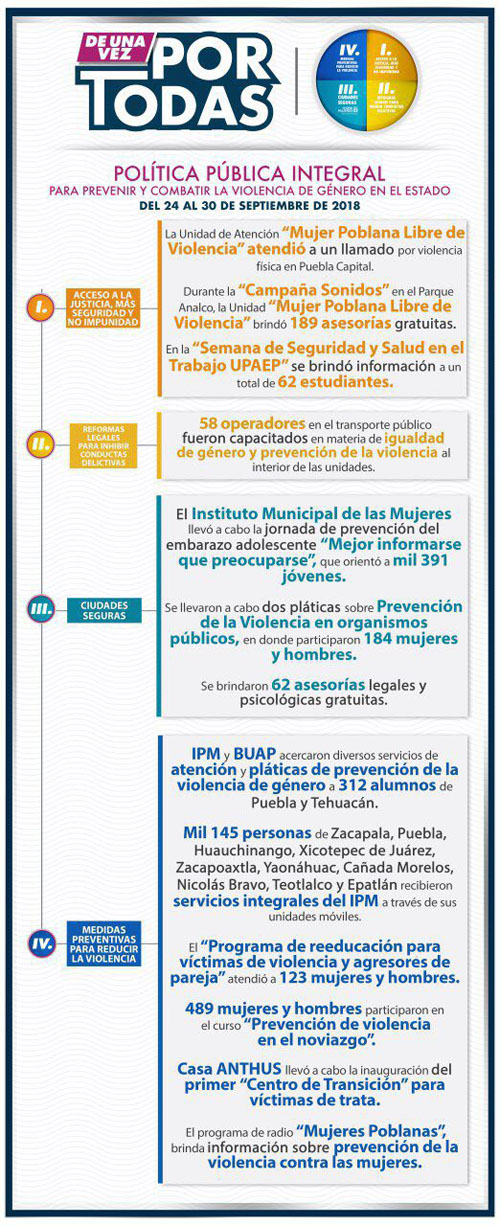 Eje 1 (Acceso a la justicia, más seguridad y no impunidad): Un llamado de emergencia por violencia física fue atendido en la colonia Historiadores, en Puebla capital, por la Unidad de Atención “Mujer Poblana Libre de Violencia” de la Secretaría de Seguridad Pública (SSP). La víctima recibió el respaldo legal y psicológico necesario por parte de la Fiscalía General del Estado (FGE) y el Instituto Poblano de las Mujeres (IPM). Para fomentar en jóvenes y adolescentes la cultura de la legalidad y la denuncia, durante la “Campaña Sonidos de la SSP” en Analco, la Unidad “Mujer Poblana Libre de Violencia” brindó 189 asesorías gratuitas. De igual forma, durante la “Semana de Seguridad y Salud en el Trabajo UPAEP”, se brindó información a un total de 62 estudiantes. Eje 2 (Reformas legales para inhibir conductas delictivas): En cumplimiento a la reciente reforma a la Ley del Transporte, durante la semana, 58 operadores del transporte público fueron capacitados por el personal de la Secretaría de Infraestructura, Movilidad y Transportes, así como por el IPM, en materia de igualdad de género y prevención de la violencia al interior de las unidades. Eje 3 (Ciudades seguras): Por parte del ayuntamiento capitalino, a través del Instituto Municipal de las Mujeres, se llevó a cabo la jornada de prevención del embarazo adolescente “Mejor informarse que preocuparse”, con la presencia de mil 391 jóvenes de distintas edades. De igual forma, efectuaron dos pláticas sobre prevención de la violencia en organismos públicos, registrando la participación de 184 personas. Finalmente, se brindaron 62 asesorías legales y psicológicas gratuitas. Eje 4 (Medidas preventivas para reducir la violencia): En un ejercicio conjunto, el equipo del IPM y la Benemérita Universidad Autónoma de Puebla, acercaron diversos servicios de atención y pláticas de prevención de la violencia de género a 312 alumnos de Puebla capital y Tehuacán. De igual forma, un total de mil 145 personas de los municipios de Zacapala, Puebla, Huauchinango, Xicotepec de Juárez, Zacapoaxtla, Yaonáhuac, Cañada Morelos, Nicolás Bravo, Teotlalco y Epatlán recibieron los servicios integrales del IPM (como pláticas, orientación psicológica y jurídica) a través de sus unidades móviles de atención. El “Programa de reeducación para víctimas de violencia y agresores de pareja” de la Secretaría de Salud estatal, atendió a 54 mujeres y 69 hombres. Igualmente, 226 mujeres y 263 hombres participaron en el curso “Prevención de violencia en el noviazgo”. Esta semana, en Casa ANTHUS, se inauguró el 1er “Centro de Transición”, refugio de alta seguridad que brinda atención especializada para víctimas de trata. Finalmente, el programa de radio “Mujeres Poblanas”, emitido todos los lunes de 12:00 a 13:00 hrs, busca llevar a todos los rincones del estado información de utilidad sobre prevención de la violencia contra las mujeres.