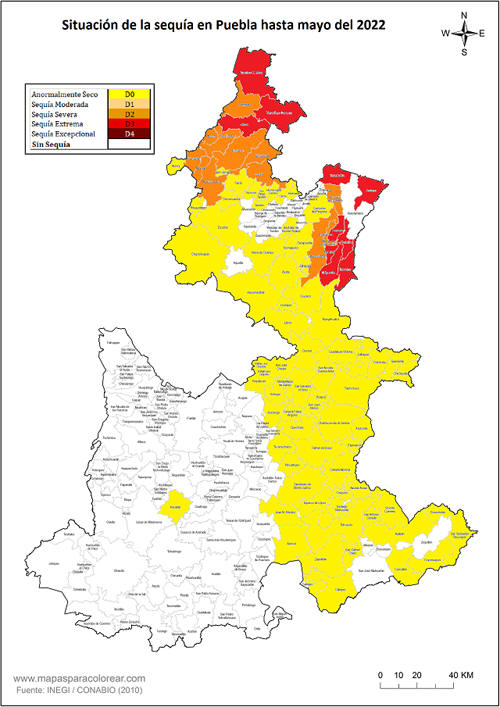 Puebla.- Prácticamente todo el noreste del estado de Puebla reportó niveles de sequía en mayo y son 11 los municipios que reportaron sequía severa, especialmente en el norte del estado, reportó el Monitor de Sequía de México, de la Comisión Nacional del Agua (Conagua).