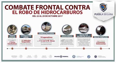 En estos operativos, se han asegurado 2 mil 305 vehículos, 787 tomas clandestinas fueron selladas y 690 personas han sido puestas a disposición de la Procuraduría General de la República. Tan solo en la semana del 23 al 29 de octubre fueron decomisados 112 mil 378 litros de combustible ilegal, se aseguraron 21 vehículos, se sellaron cinco tomas clandestinas y seis presuntos delincuentes fueron detenidos, en un total de 19 operativos. De esta manera, Puebla Segura reitera su voluntad permanente de combatir la delincuencia organizada hasta sus últimas consecuencias.