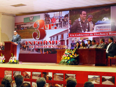El alcalde, regidores, síndico municipal y el Secretario del Ayuntamiento, presidieron la sesión, en donde el diputado del distrito IV y representante del Gobernador, Germán Martínez Manzano, destacó la transparencia del informe y el trabajo que logró poner a Zacapoaxtla en el camino de la modernidad y el desarrollo.