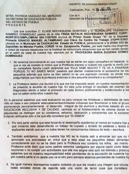 Guadalupe Yasareth Ramírez Domínguez, madre de la alumna que cursa el primer grado, relató que a través de una amiga de su hija, tuvo conocimiento de que su profesora María Eugenia Gómez Domínguez, la había estado golpeando, situación que fue confirmada por Frida, quien dijo que no había querido hablar por miedo a la docente.