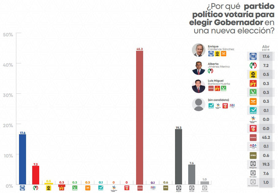 De acuerdo con el estudio, el 45.8 por ciento de los encuestados indicó que votaría el 2 de junio por Luis Miguel Barbosa, que representa a Morena, el PT y el PVEM; mientras que el 18.4 por ciento lo haría por Enrique Cárdenas que encabeza al PAN, PRD y Movimiento Ciudadano.