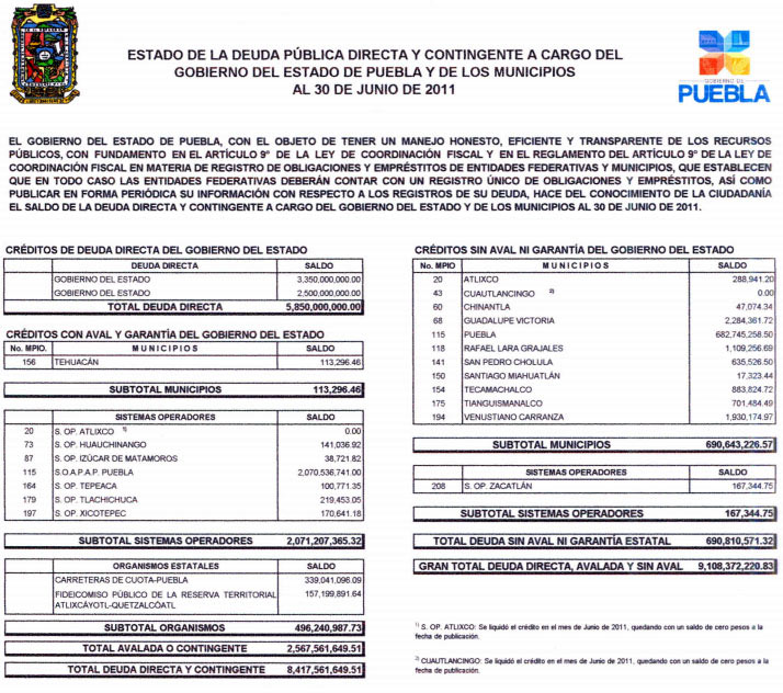 La deuda heredada por Marín requiere 28 millones mensuales del erario: Finanzas (e-consulta).- El gobierno del estado informó que la deuda directa que heredó la pasada administración estatal a cargo de Mario Marín Torres requiere de un pago mensual aproximado de 28 millones de pesos, derivado del periodo de gracia para el pago de capital pactado en los contratos. A través de un comunicado enviado por la Secretaría de Finanzas, la administración estatal indicó que al iniciar este sexenio la deuda directa del estado tenía un saldo de 5 mil 850 millones de pesos, sin contar los pasivos de los organismos estatales y de los municipios, con y sin aval del gobierno de Puebla. En el documento se indica que la administración estatal inició con el pago de capital de uno de los dos créditos por 2 mil 600 millones de pesos, con lo que se inicia la disminución de dicha deuda. El estado que guarda la deuda pública directa y contingente a cargo del gobierno poblano y los municipios al 30 de junio de 2011 fue de 9 mil 108 millones de pesos, de los cuales 5 mil 850 millones de pesos corresponden a la deuda directa heredada por del gobierno anterior, 2 mil 568 millones de pesos a la deuda avalada a cargo del gobierno del estado y 691 millones de pesos a la deuda sin aval ni garantía estatal.