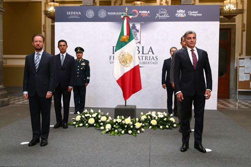Inician en Puebla actividades del mes Patrio - Presiden la ceremonia solemne de izamiento de Bandera y la primera guardia de honor al Lábaro Patrio - El mandatario colocó el Bando Solemne alusivo a las fiestas patrias en el Palacio Municipal y en las sedes de los tres Poderes del Estado 3 Septiembre 2018