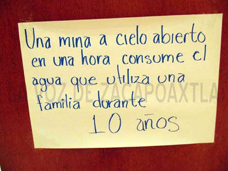 Para los proyectos mineros se requiere de utilizar grandes cantidades de agua, de ahí que se autorizaron también ocho hidroeléctricas en la zona, una de ellas en San Juan Tahitic en Zacapoaxtla y una más en los municipios de Nauzontla, Zoquiapan, Xochitlán, Zapotitlán y Huitzilan, con la finalidad de controlar con estos dos proyectos las aguas de los ríos Apulco, Zempoala y el Ateno. “Una Mina a cielo abierto en una hora consume el agua que utiliza una familia durante diez años”. Dentro de los acuerdos en la Plenaria al término de las mesas de trabajo, se formó una comisión en el municipio, la cual buscará al próximo Presidente Municipal de Tlatlauquitepec, Ángel Guerrero Herrera, a quien se le solicitará que niegue los permisos de uso de suelo para la zona de Calatepec y El Canal. Se informó que continuarán las asambleas informativas en diversas comunidades de toda la Sierra Nororiental, para que la gente determine sus métodos de defensa en contra de estos proyectos de muerte.