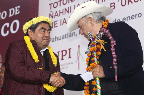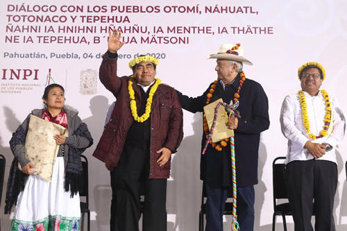 En este lugar, el titular del Ejecutivo Federal manifestó su disposición de trabajar a favor de los pueblos originarios, así como su oposición al fracking, el uso de semillas transgénicas y los proyectos mineros, de ahí que reportó que no ha entregado ninguna concesión durante su mandato. Señaló que desde el gobierno de Carlos Salinas de Gortari hasta el de Enrique Peña Nieto se concesionaron 90 millones de hectáreas para proyectos mineros, es decir, una cuarta parte de las 200 millones que integran el territorio nacional. Aunado a ello, el presidente López Obrador reportó que si bien logró un ahorro de 4 mil 500 millones de dólares, halló contratos leoninos de gasoductos, en los que se establece que aunque no se concreten estos proyectos, el gobierno está obligado a pagar a las empresas involucradas. Lo anterior lo informó a raíz de manifestaciones de pobladores que se oponen a la construcción del gasoducto Tuxpan- Tula. En ese sentido, López Obrador prometió en esta comunidad de San Pablito que dicho gasoducto no atravesará los cerros "sagrados" de la región, aunque el gobierno tenga que pagar o proponer nuevos trazos. En esta primera gira de trabajo del año que realiza por Puebla, López Obrador anunció, por otro lado, la continuidad del programa "La Escuela es nuestra" y la aplicación de otro programa de construcción de caminos, cuyos recursos se entregarán a las autoridades de los municipios para que los ejecuten de manera directa, mecanismo que permitirá reactivar la economía de los pueblos. En este acto estuvieron presentes el director general del Instituto Nacional de los Pueblos Indígenas (INPI), Adelfo Regino Montes; la coordinadora nacional de Becas para el Bienestar "Benito Juárez", Leticia Ánimas, y la alcaldesa María Guadalupe Ramírez Aparicio.