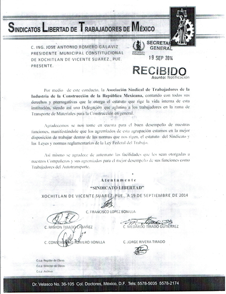 En los oficios firmados por los agremiados Francisco López Bonilla, Ramón Tirado Cabañez, Medardo Tirado Gutiérrez, Jorge Rivera Tirado y Constantino Romero Bonilla, pidieron al edil que los tomara en cuenta, pero ante la posición adoptada por el ayuntamiento, dijeron que tomarán otras medidas de presión. Aseguraron que en lugar de pensar en el bienestar de los ciudadanos de Xochitlán, el alcalde se ha dedicado desde el inicio de la administración a beneficiar a personas que lo apoyaron en campaña, entre ellos profesores que tienen sueldos de entre 25 y 30 mil pesos mensuales.